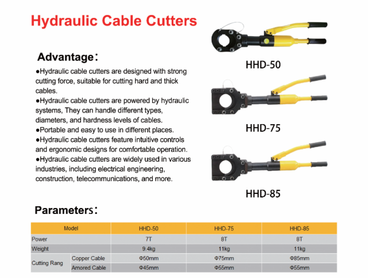 ● Hidrolik kablo kesiciler, sert ve kalın kabloları kesmeye uygun, güçlü kesme kuvvetine sahip olarak tasarlanmıştır.